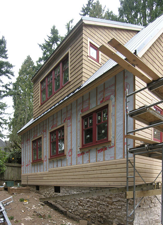 long-term durability, local production and manufactured products. The exterior includes cedar shingles, horizontal cedar