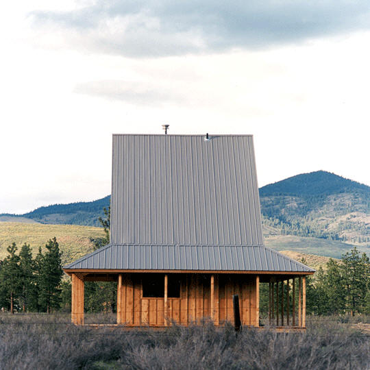 vacation cabin. The tall gable roof over the elongated plan gives the